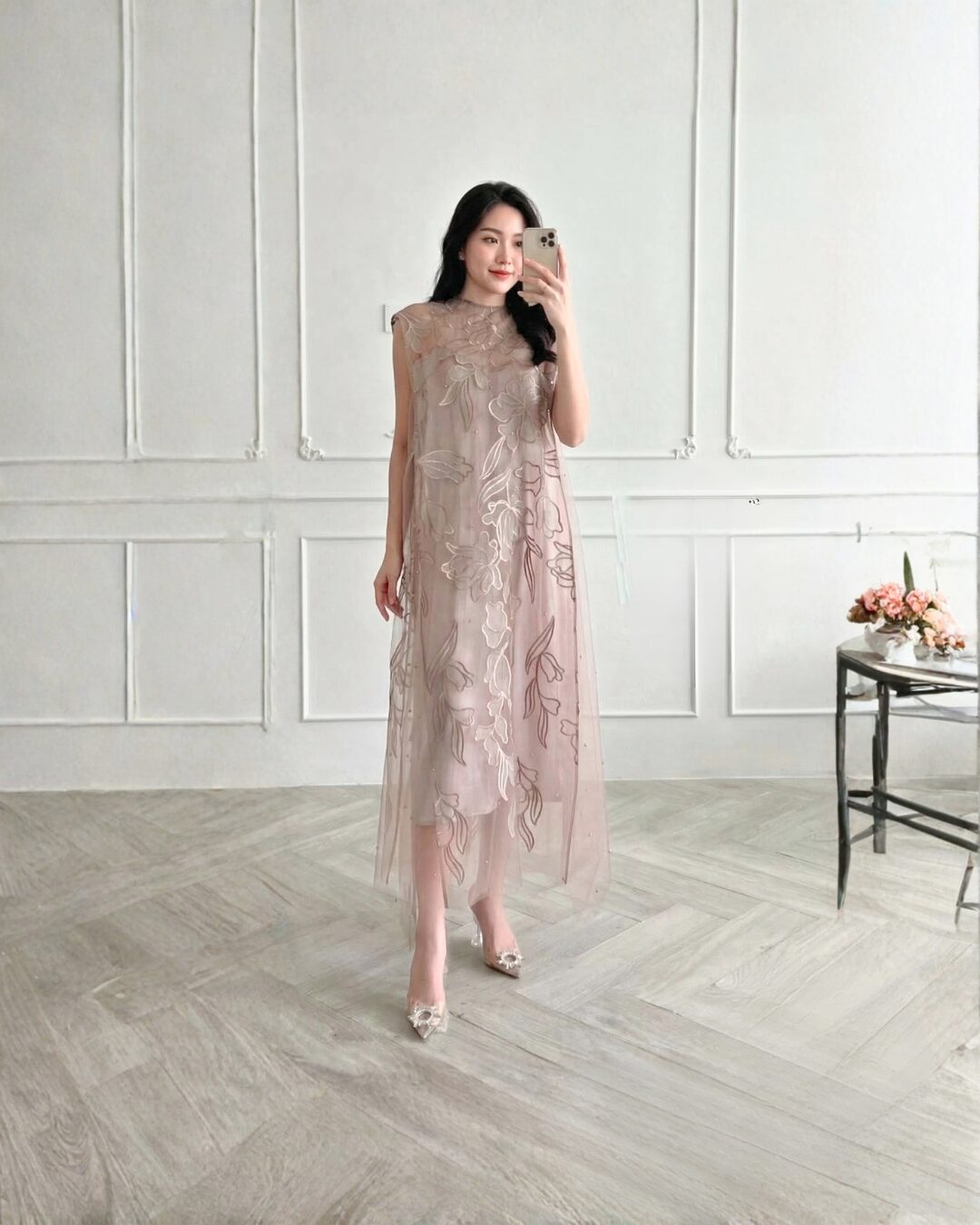 & Free ShippingTouch Up • Nude • Size: All Size • Dress • Long Dress • Inner (fr bust): 98-128 Outer: 133 • Party Guest, Hijab Friendly, Maternity • Floral • B 88-90 / W 100 / H 120 • Original Price: Rp1,450,000 • Deposit Rp250,000