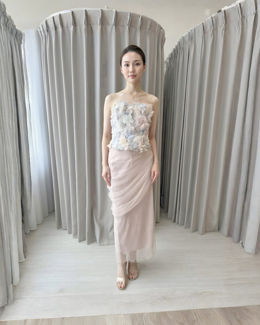 & Free ShippingTouch Up • Pink • Size: M-L • Sets (Top & Bottom) • Midi • Top: 33 Skirt: 93 • Party Guest • Floral • B 90-96 / W 74-78 / H 94-96 • Original Price: Rp1,850,000 • Deposit Rp250,000