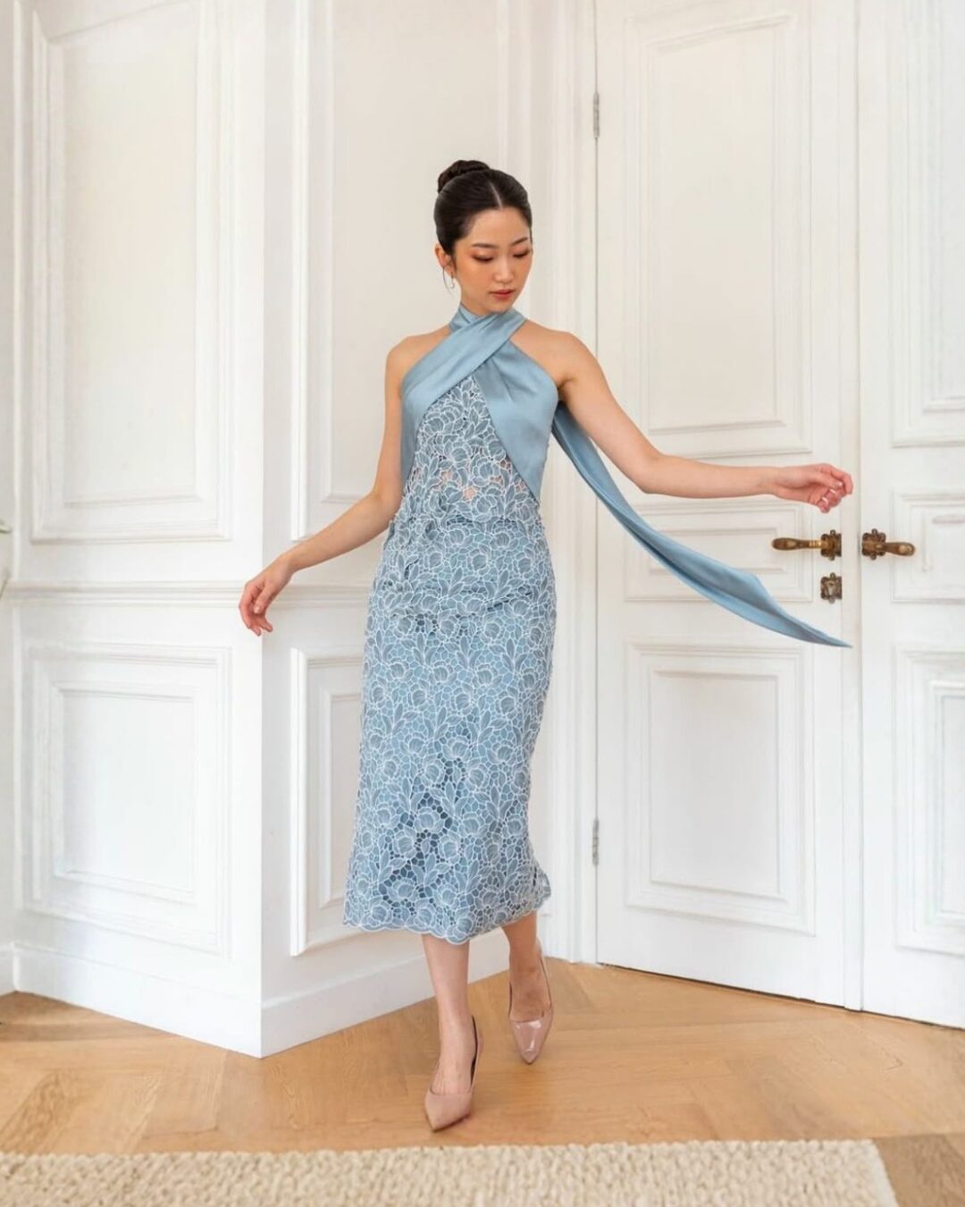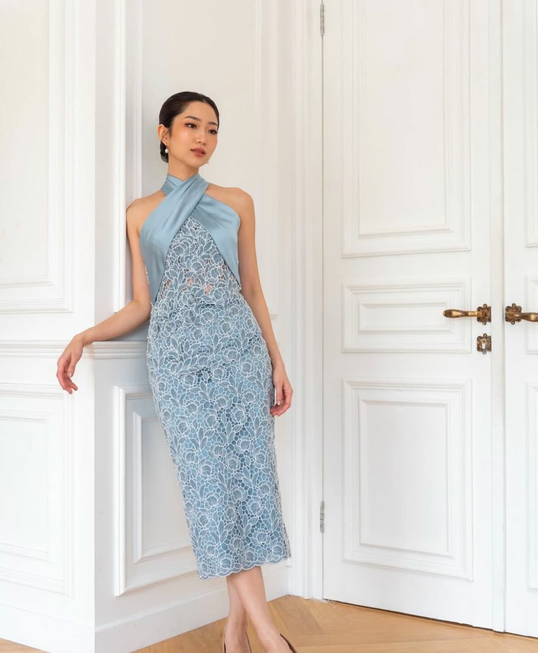 & Free ShippingSavvy The Label • Blue • Size: M • Dress • Midi • Fr neck : 118 Fr bust: 115 • Party Guest • Floral • B 78-86 / W 70-74 / H 92-94 • Original Price: Rp2,870,000 • Deposit Rp300,000