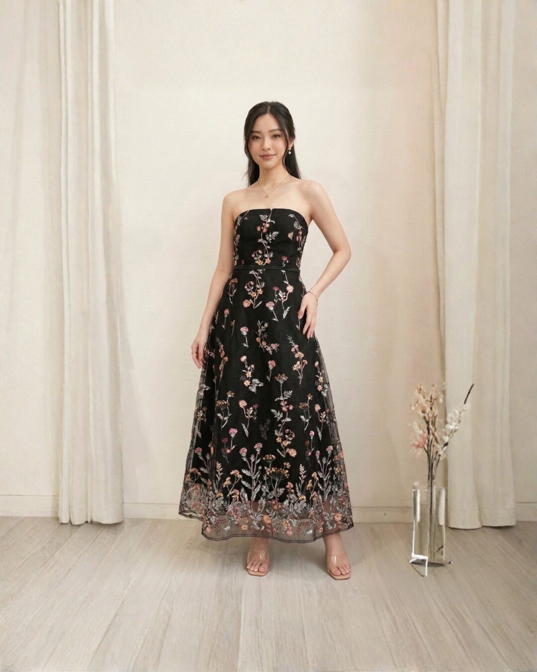 & Free ShippingSognare • Black • Size: S-M • Dress • Long Dress • Fr waist: 92 Fr shoulder: 115 • Party Guest • Floral • B 80-84 / W 68-72 • Original Price: Rp2,999,000 • Deposit Rp300,000