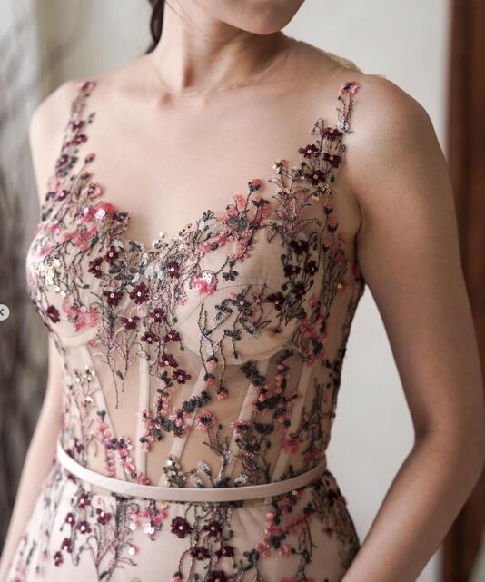 & Free ShippingSavvy The Label • Nude • Size: M • Dress • Long Dress • Fr shoulder 120 • Party Guest • Floral • B 86 / W 70-74 • Original Price: Rp3,650,000 • Deposit Rp300,000