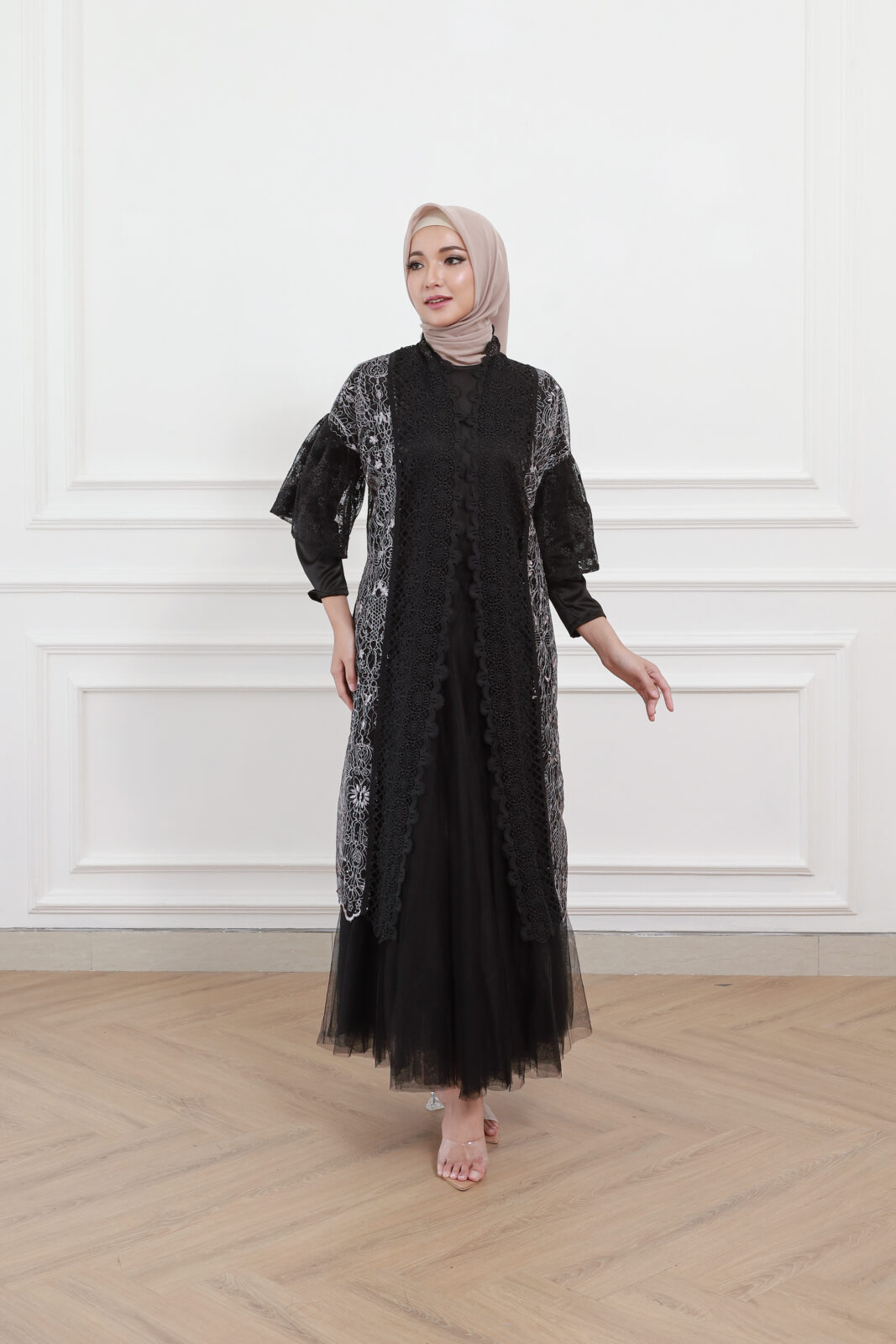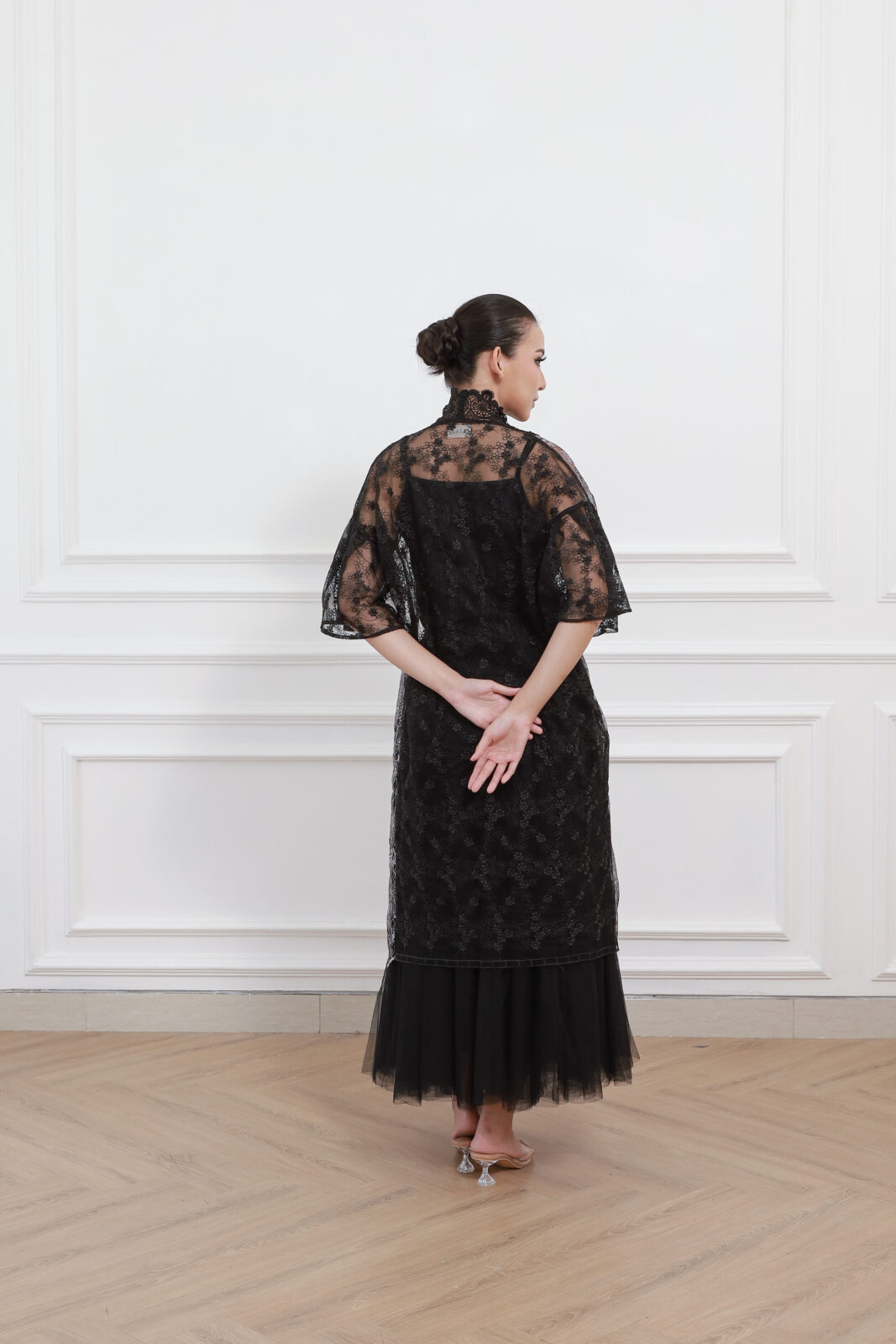 Kina Atelier • Black • Size: All Size • Dress • Long Dress • Inner Top: 61 Outer Top: 104 Arm: 40 Armhole:- Skirt (PxL): 95×100 • Hijab Friendly • Minimalist • B 100 • Original Price: Rp699,000 • Deposit Rp150,000